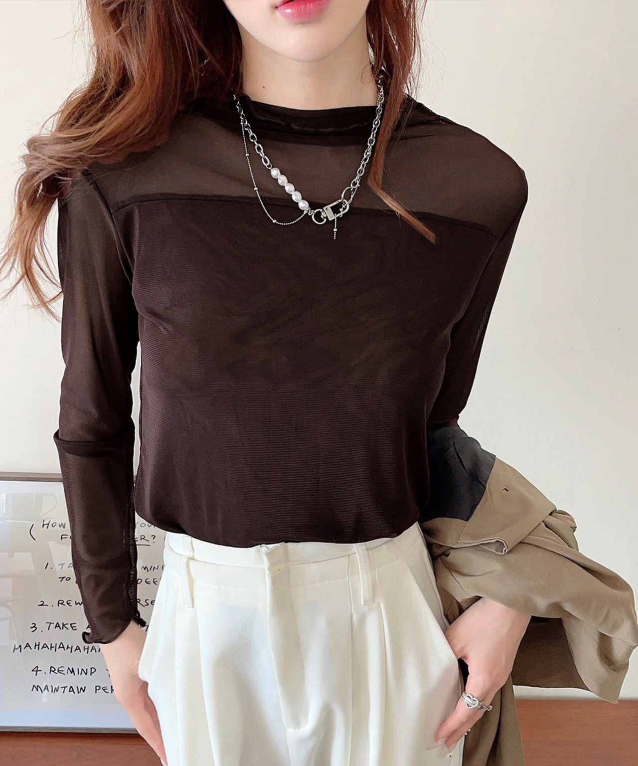 インナー大人可愛い/モックネック春秋服/透け感トップス大人
