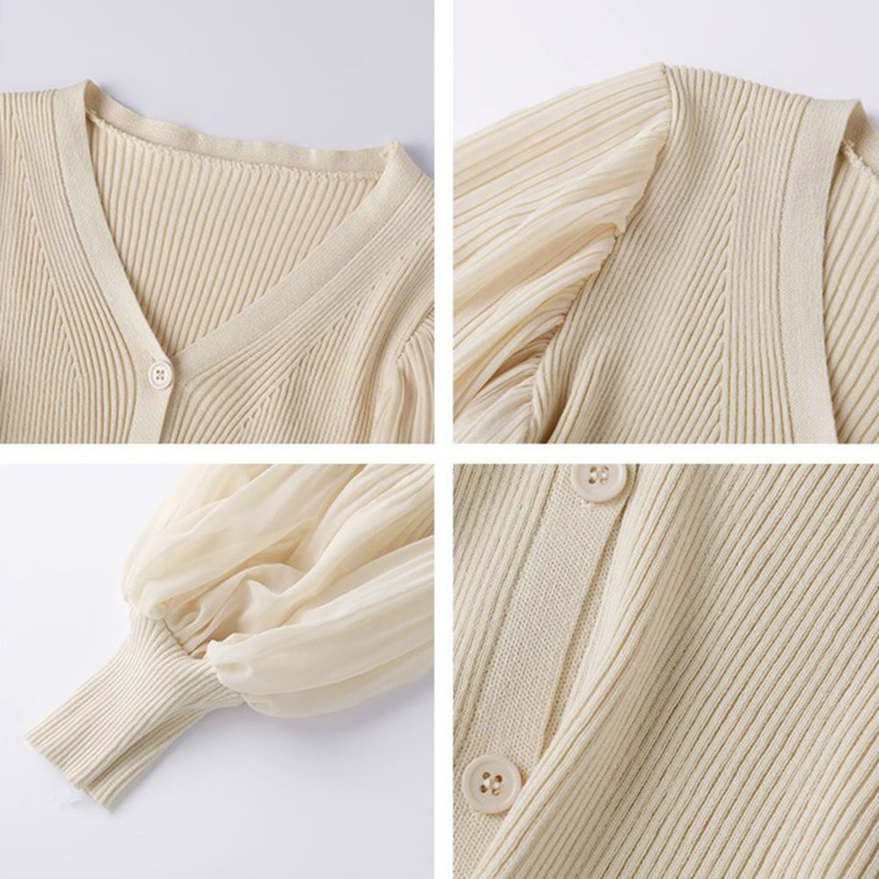 落ち感のある大人可愛さを演出する前開きランタンスリーブニットカーディガン。