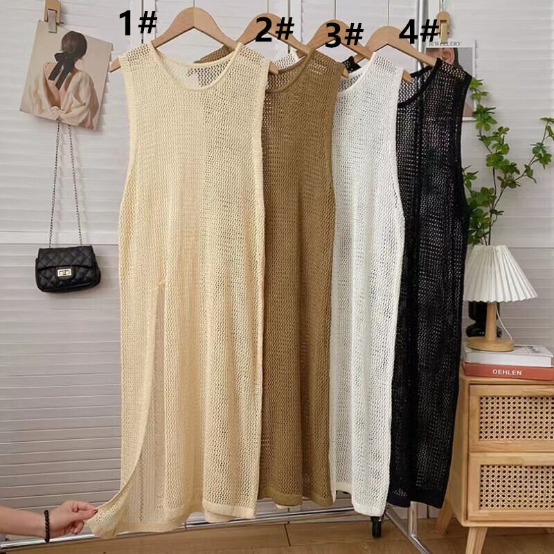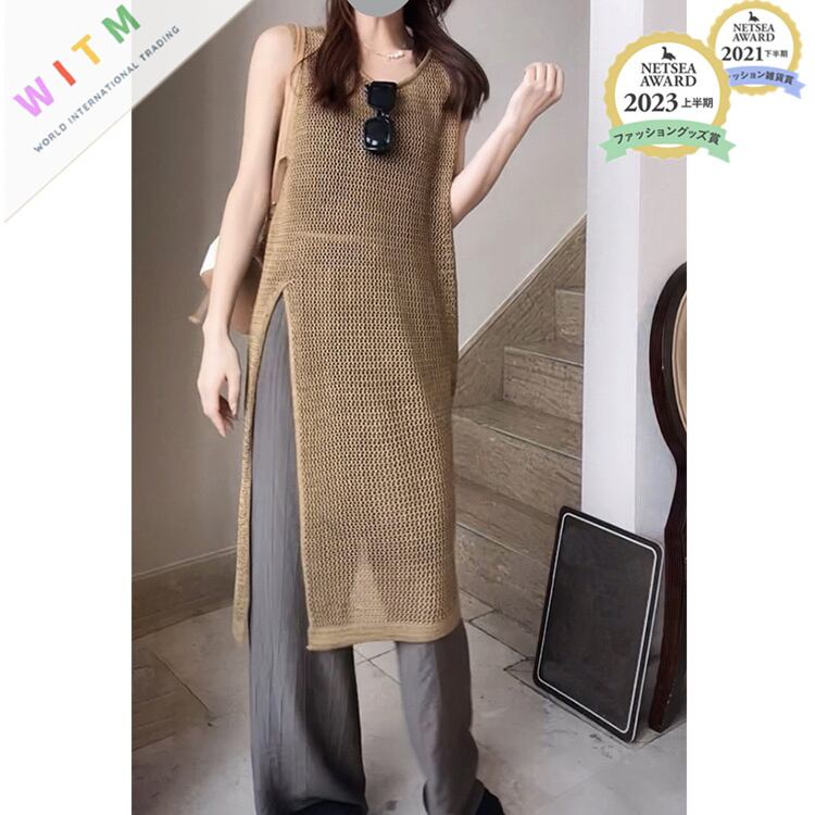 2024夏新作 メッシュ ニットベスト ロング丈ベスト スリット レディースファッション 透かし編み