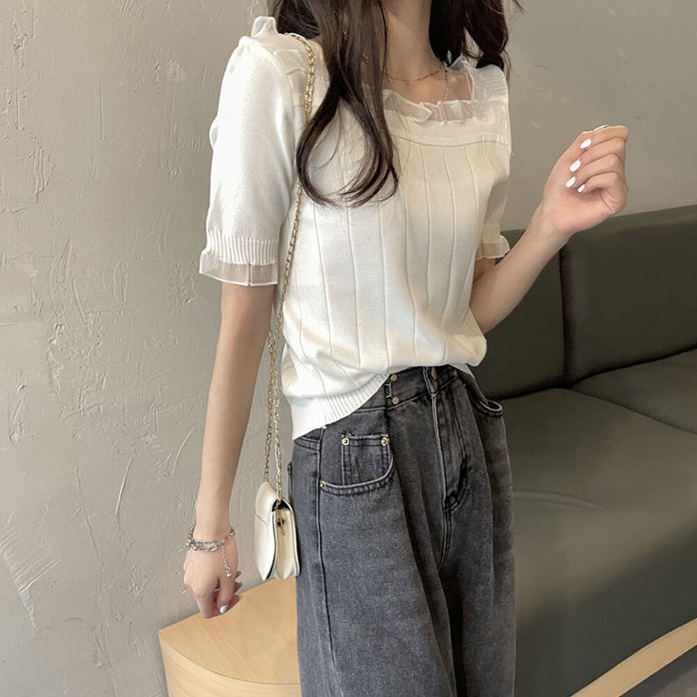太めリブ ニットトップス レディース 韓国 カットソー お洒落 春夏 ニットウェア 半袖 薄手ニットソー プルオーバー