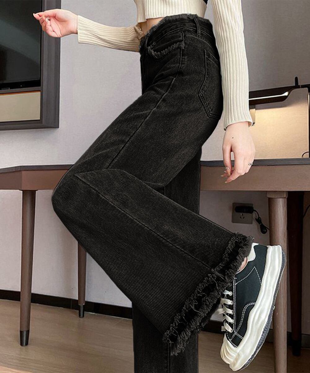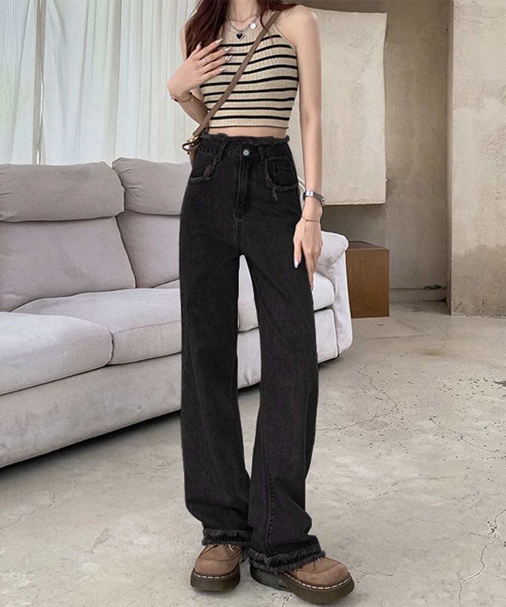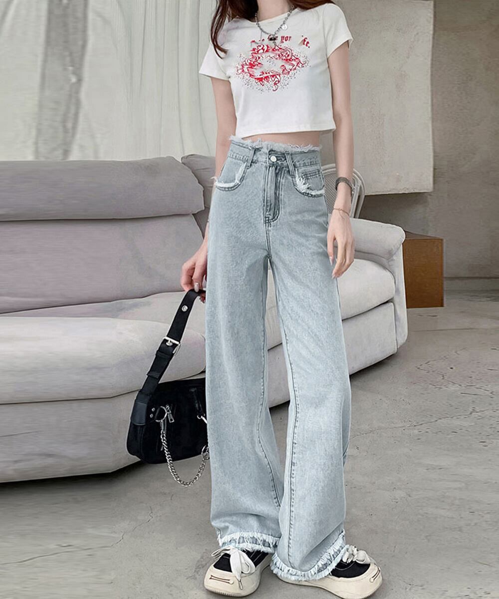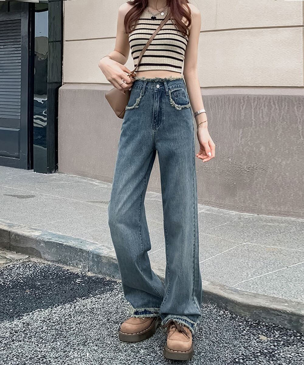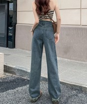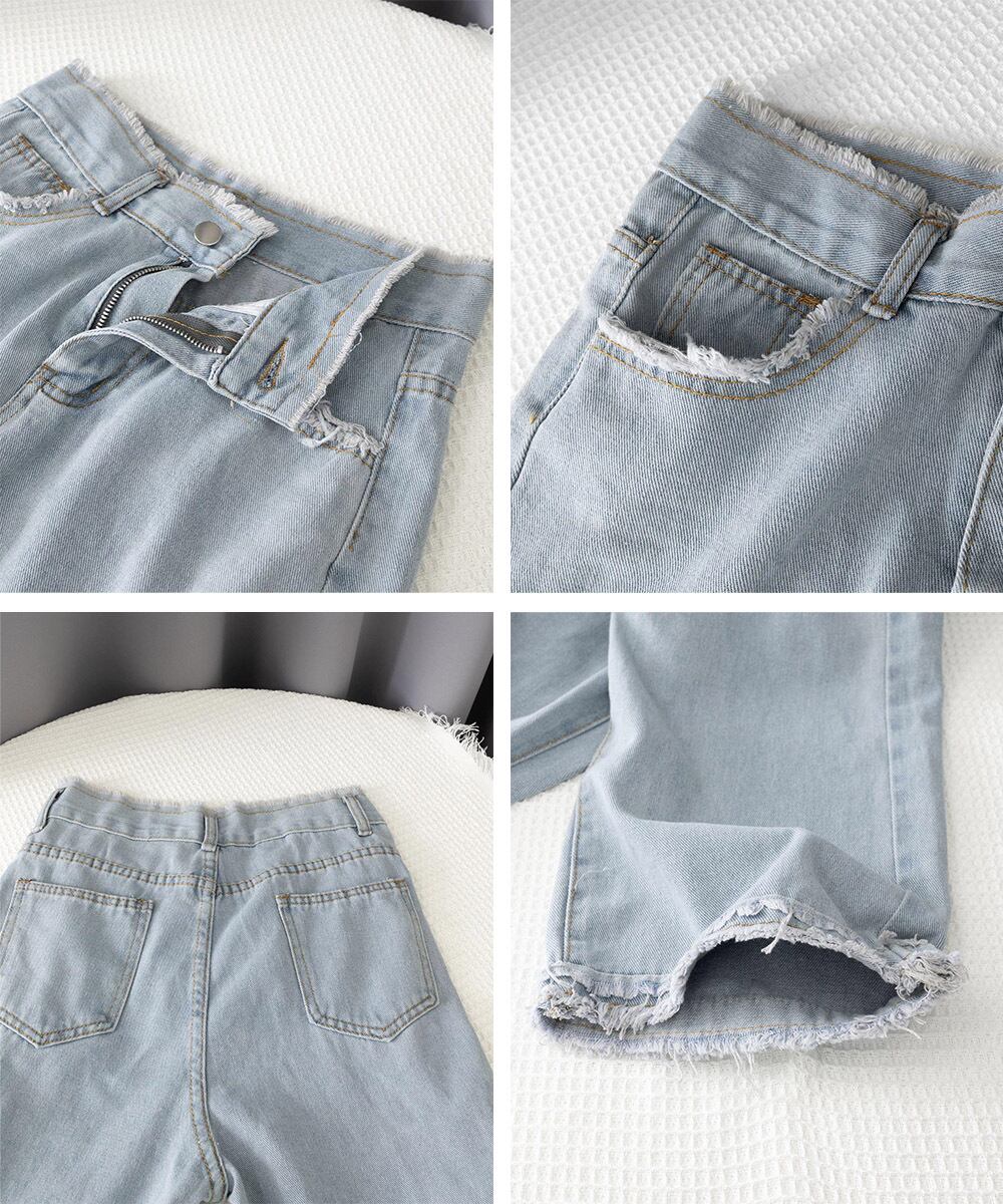 レディース ストレートパンツ ゆったりセミワイドパンツ 韓国風ジーンズ 脚長ロングパンツ 着やせジーパン オールジーンズ