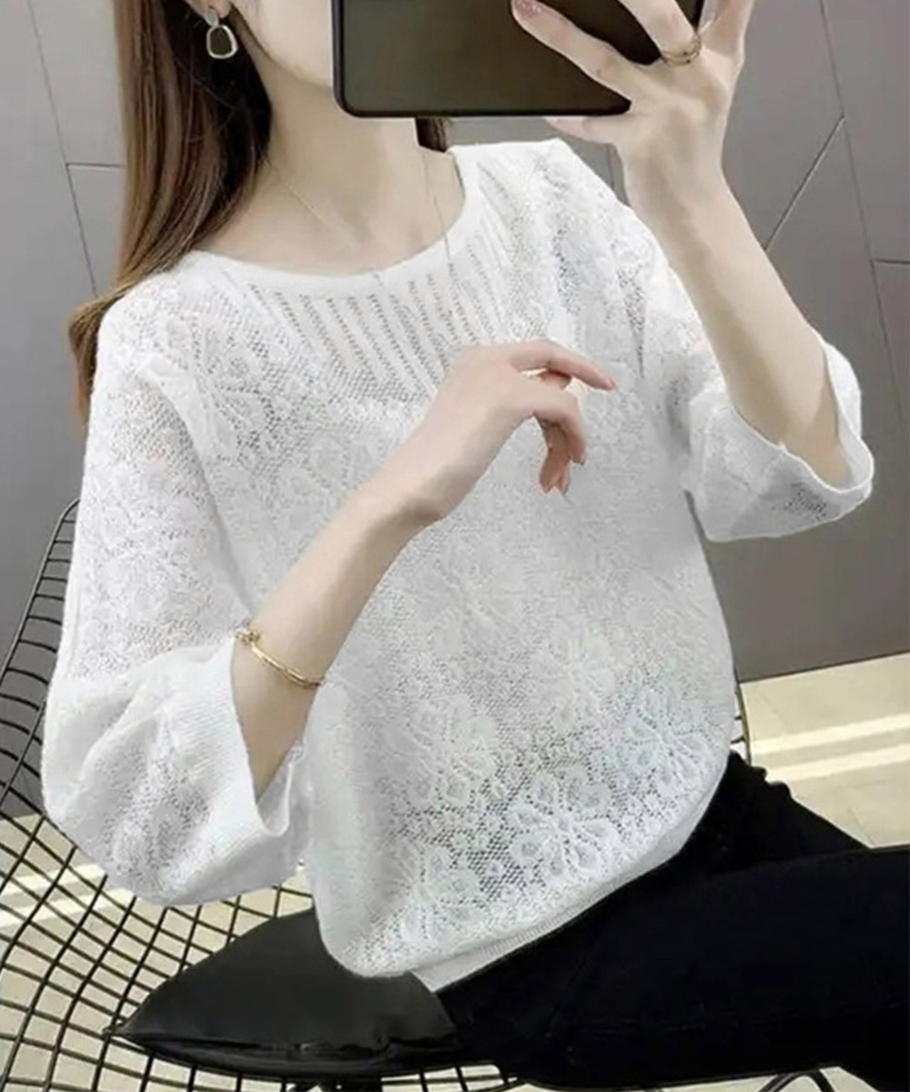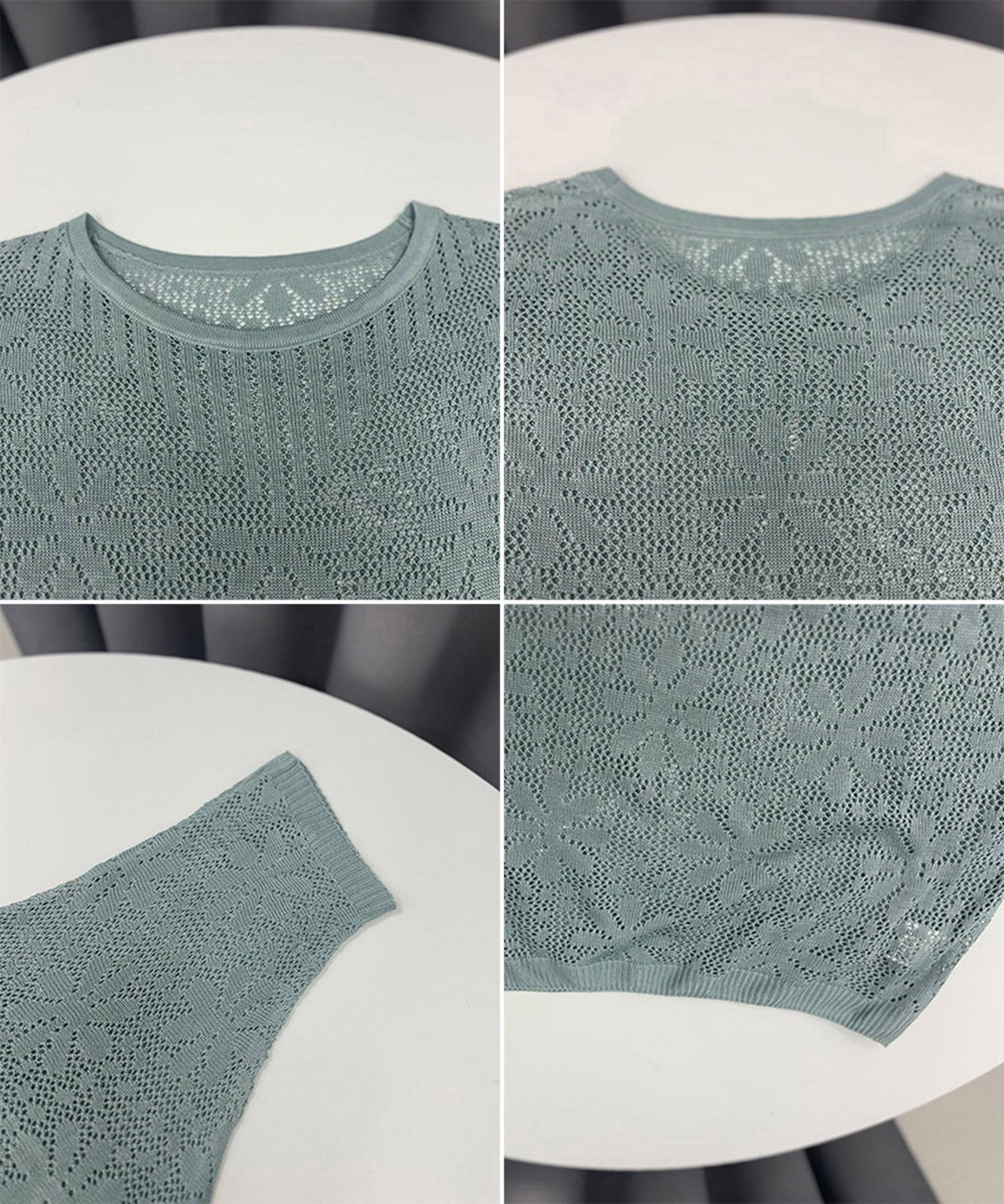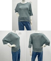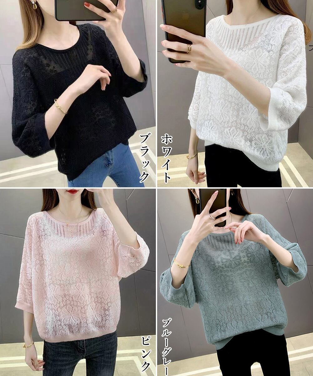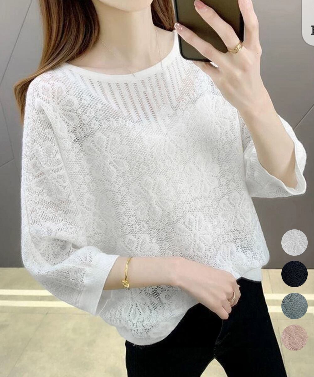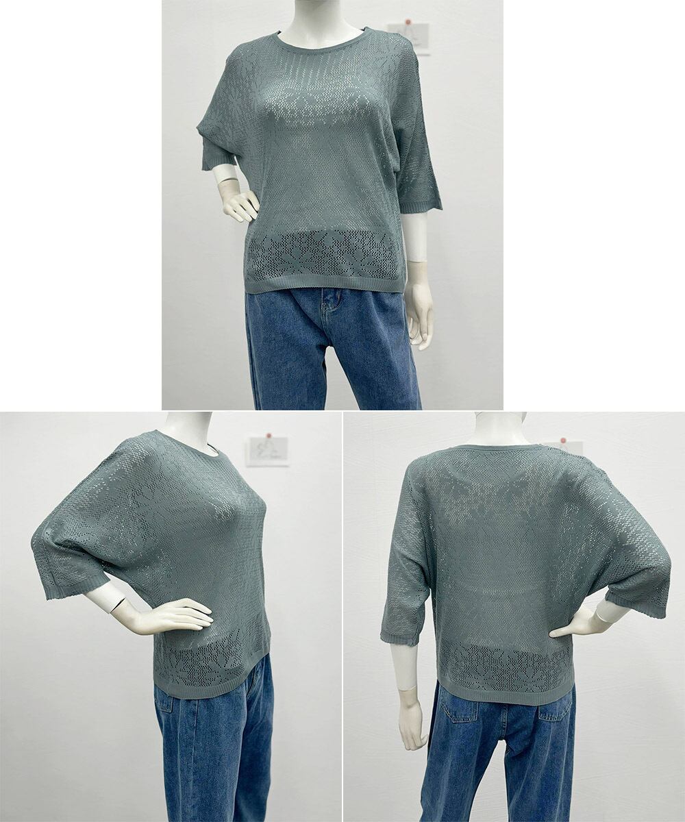 サマーニット 七分袖透かし編みトップス
