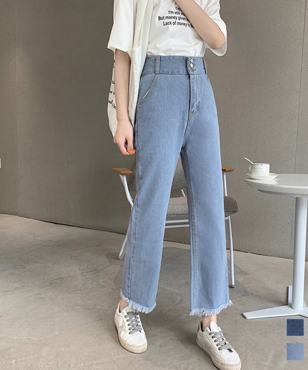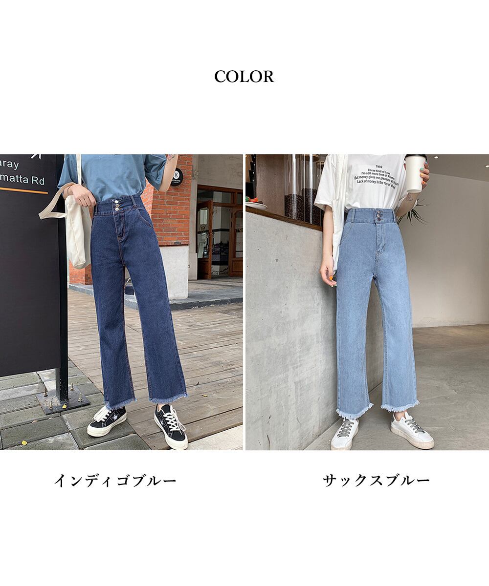 レディース ダメージ ストレートデニムパンツ 大人カジュアルジーパン 体型カバー美脚脚長 セミワイドデニム カットオフ