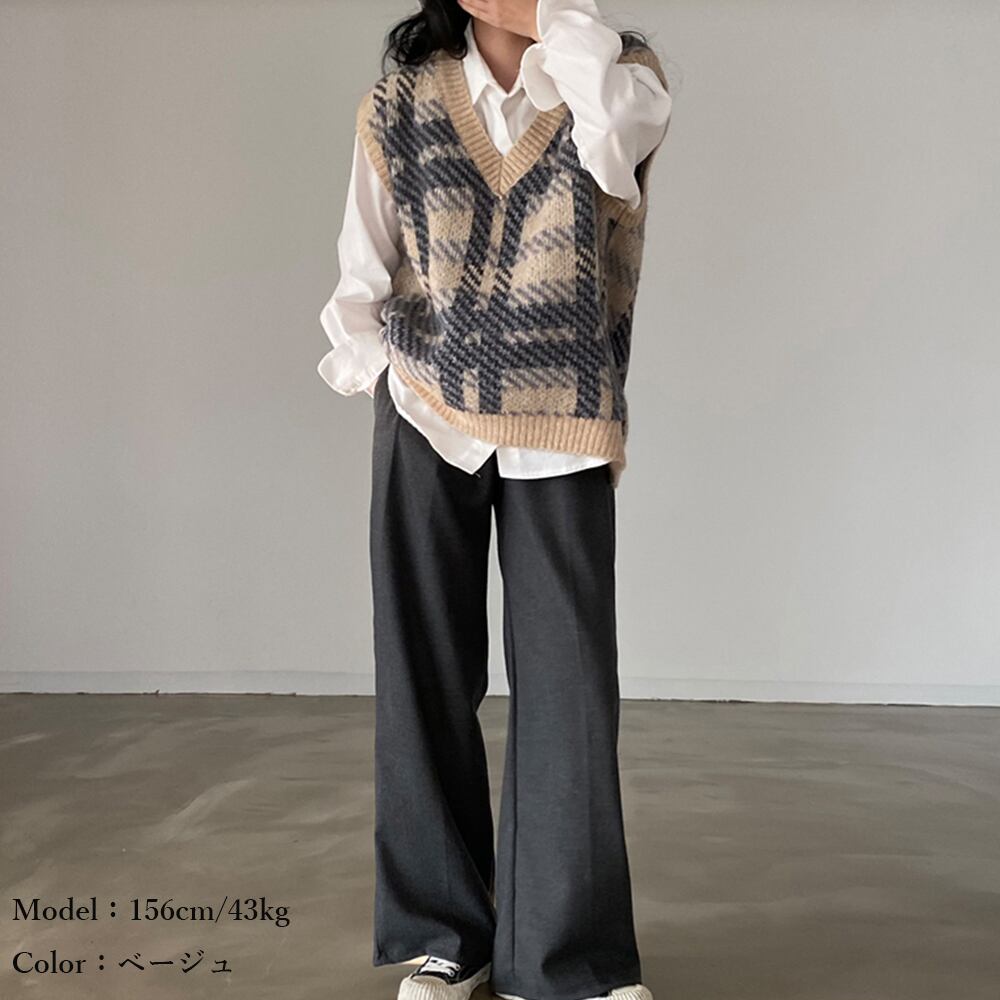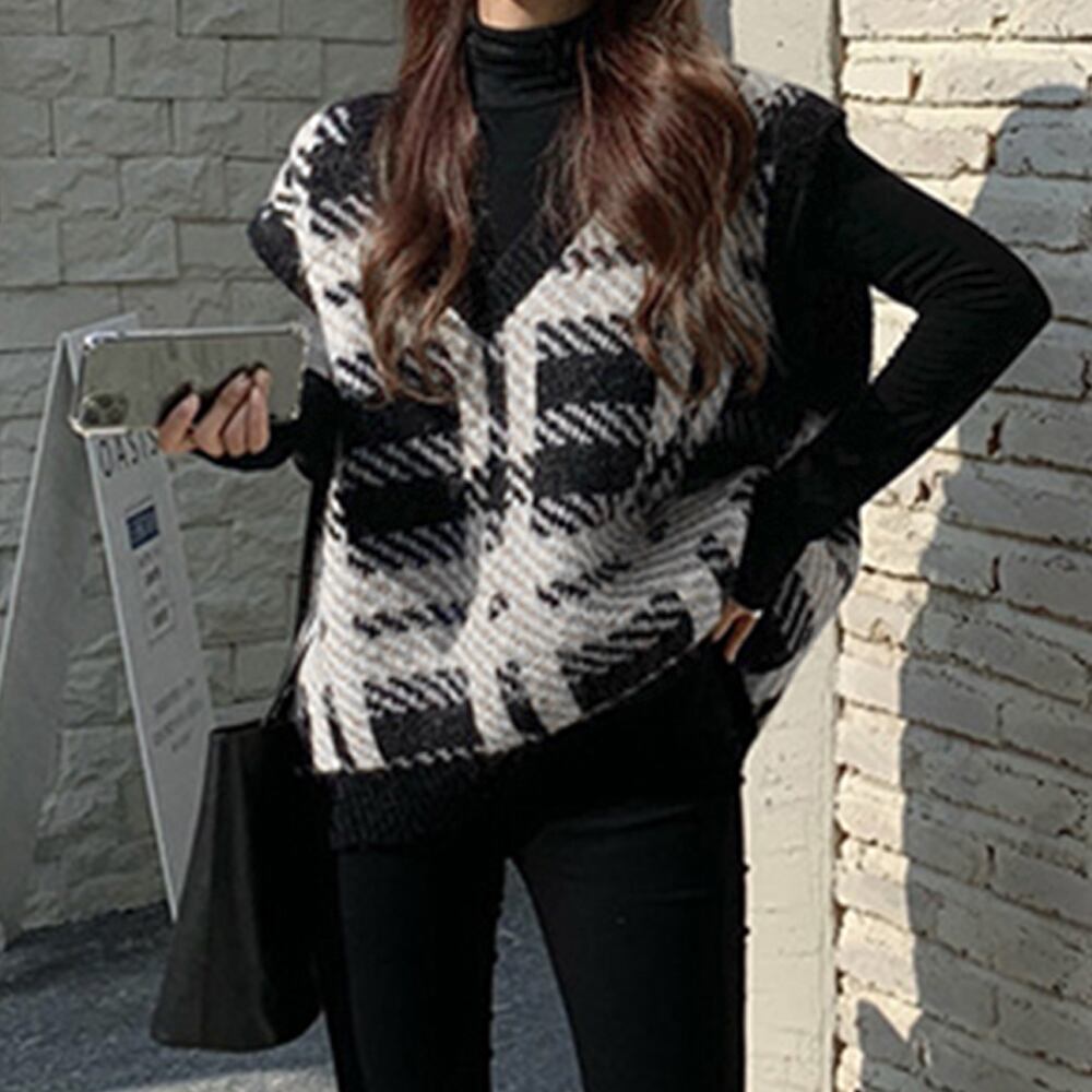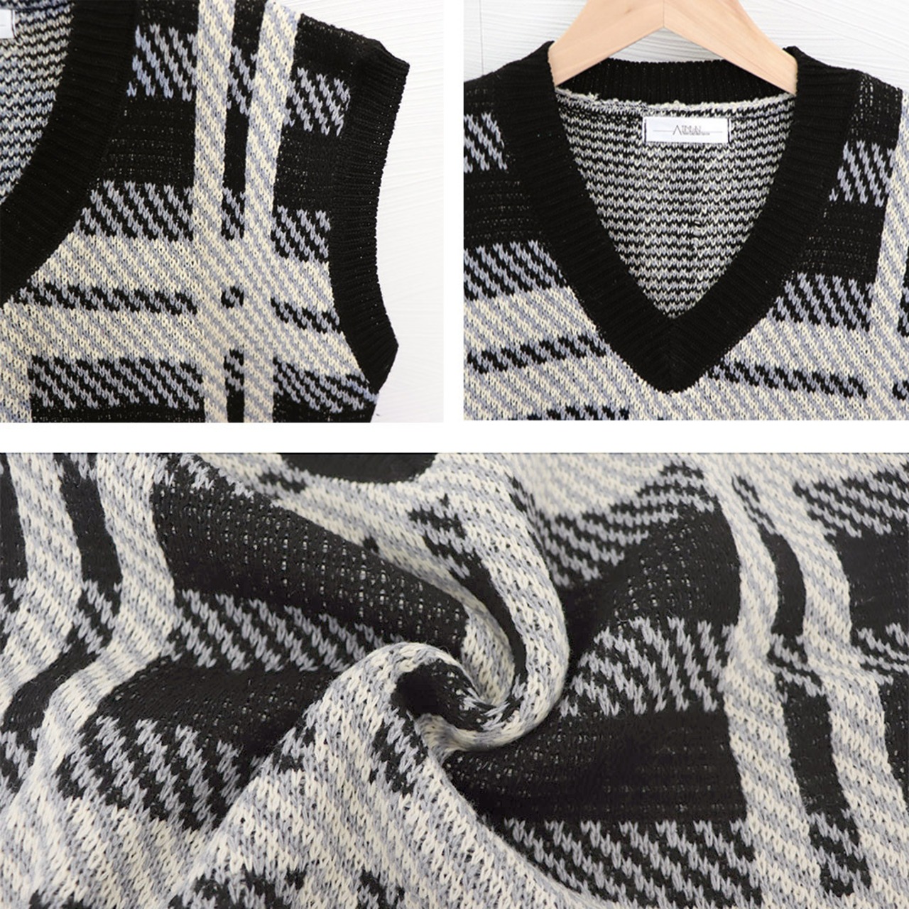 韓国風 チェック柄ベスト ショート丈 ノースリーブ ニットトップス レイヤードベスト Vネック レトロ 20代 30代