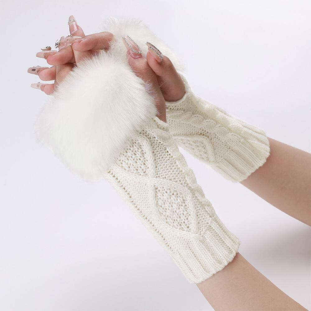 暖かな雰囲気を醸し出すケーブル編みのファー付きアームウォーマー