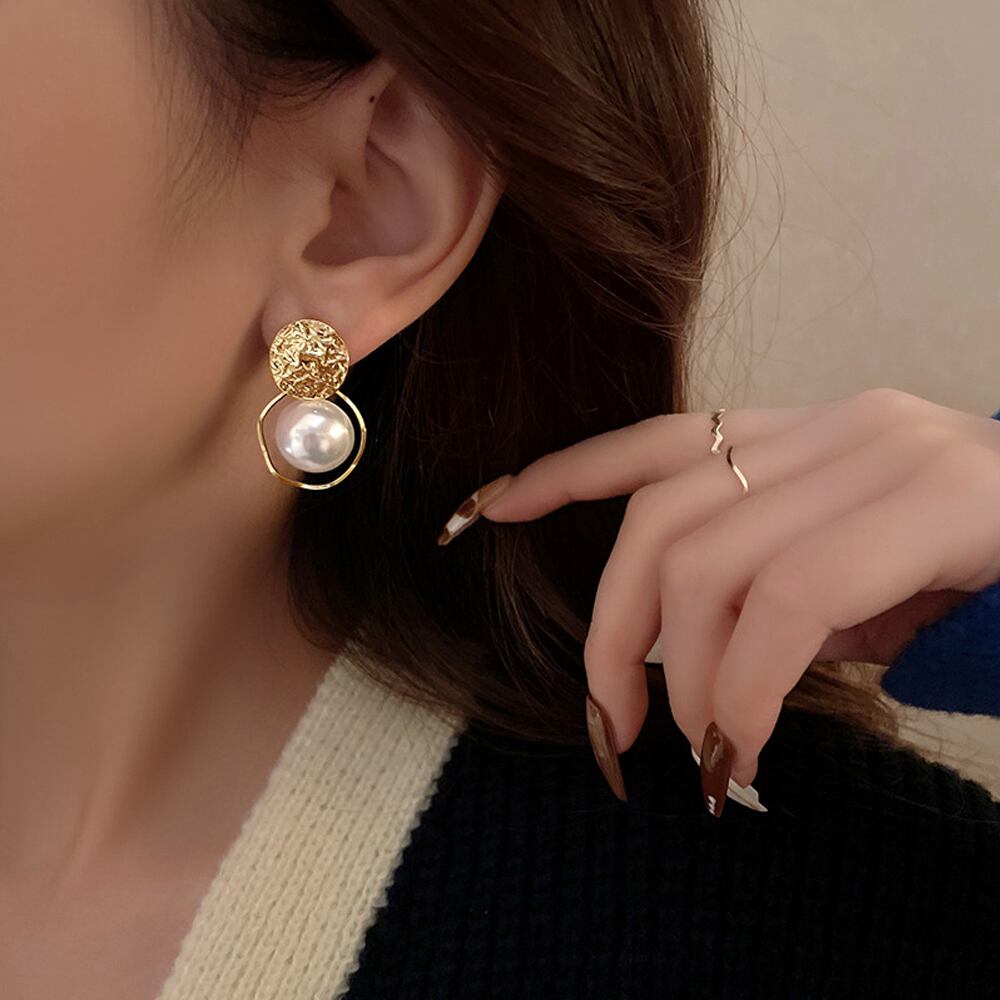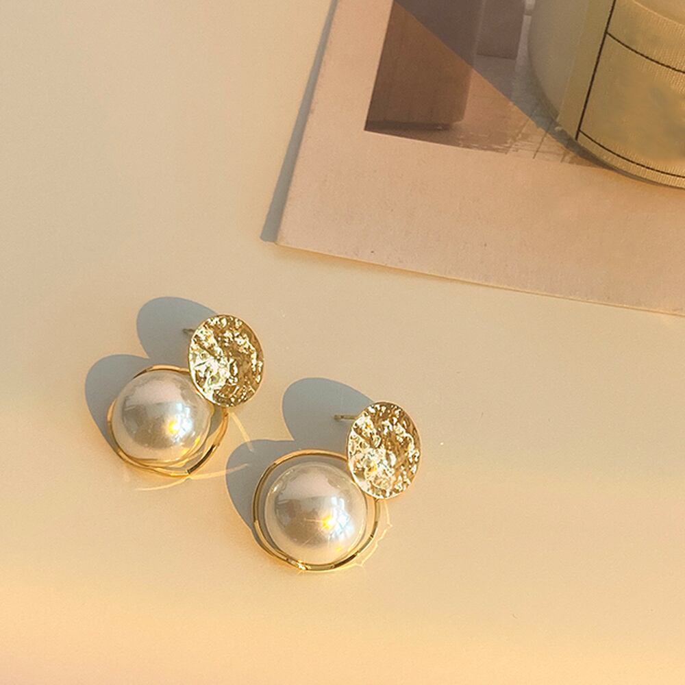 合金リングに大ぶりの一粒フェイクパールのシンプルDesignオトナ女子ピアス